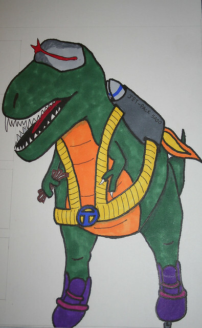 [caption id="" align=“aligncenter” width=“394” caption=“You probably notice the little penciled in boxes on the left side of the dino. That is where close-ups of all the stuff that makes him awesome will be."]